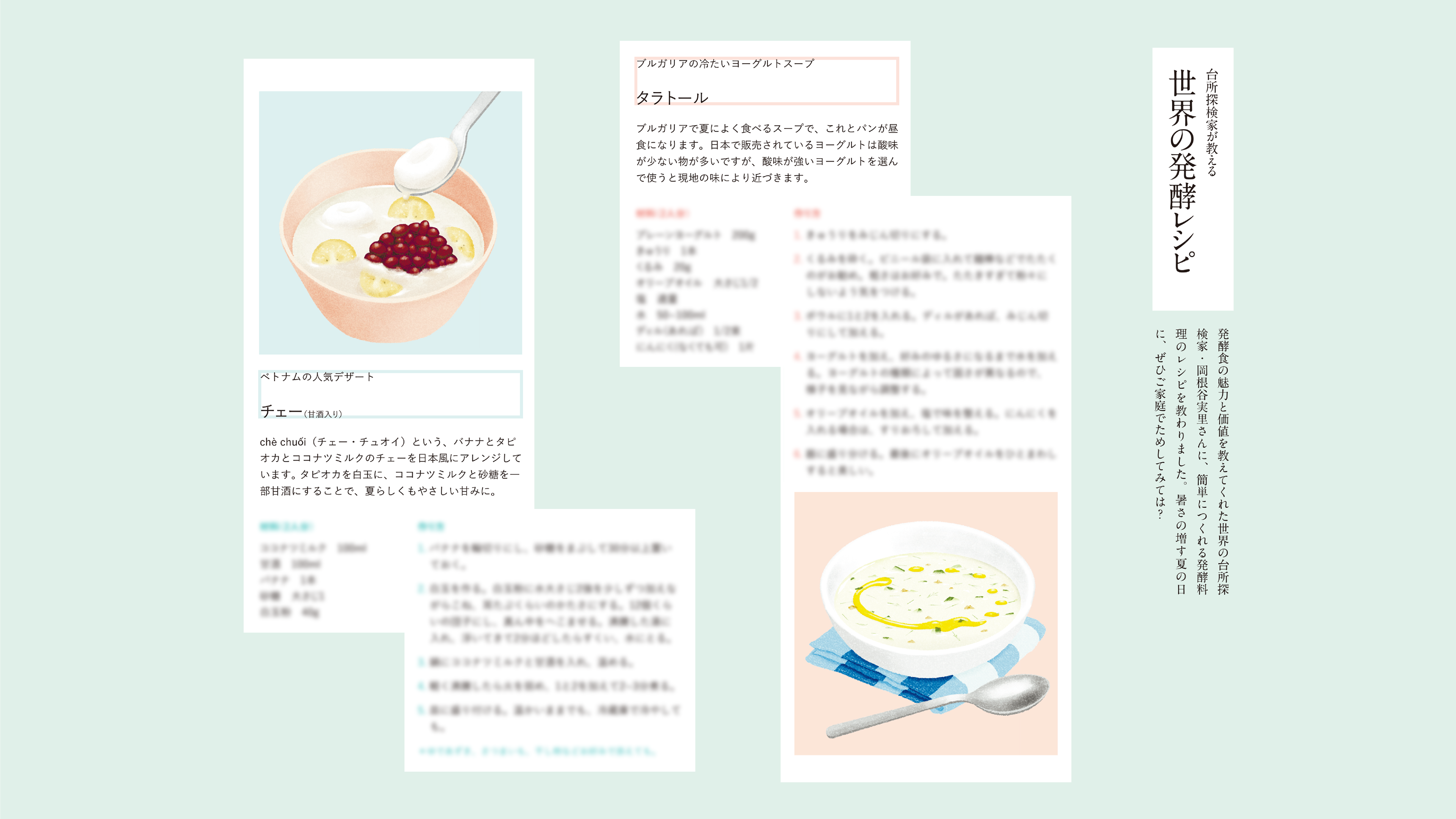 台所探検家・岡根谷実里さんご紹介の発酵料理、ベトナムのチェーとブルガリアのタラトールです。